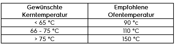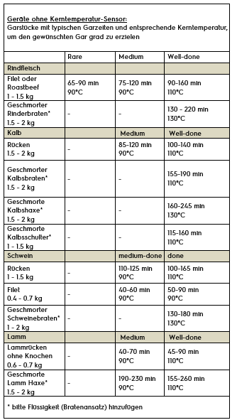 - In der Bedienungsanleitung finden Sie Hinweise, welche Temperatur und welche Dauer für welche Fleischzubereitung zu verwenden ist.