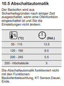 - Wird der Backofen bei einer Temperatureinstellung bis 115°C jedoch länger als 12,5 Stunden genutzt, ohne dass Temperatur oder Beheizungsart verändert werden, schaltet die Abschaltautomatik den Backofen aus.