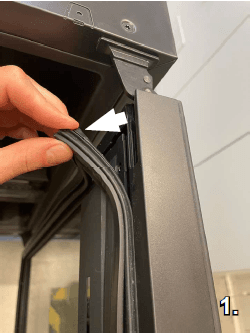 Öffne die Tür. Ziehen Sie die Dichtung vorsichtig an der oberen Ecke heraus und gehen Sie anschließend zur Unterseite über!