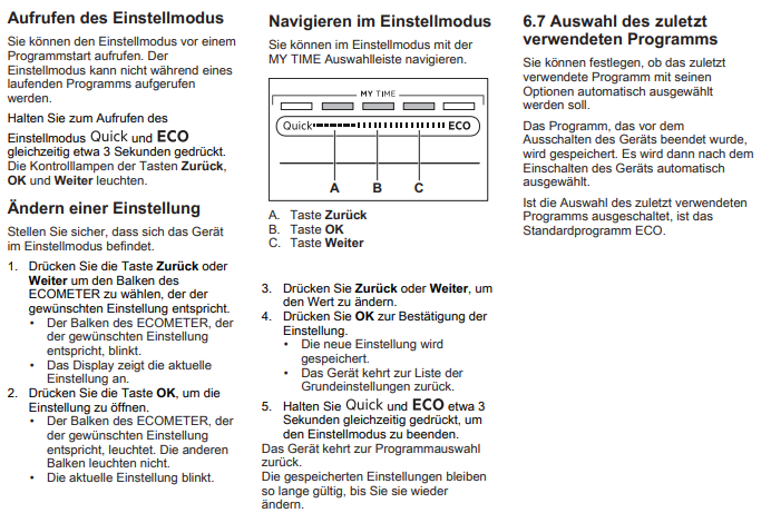 - Das zuletzt verwendete Programm inklusive der gewählten Optionen werden beim nächsten Einschalten angezeigt.