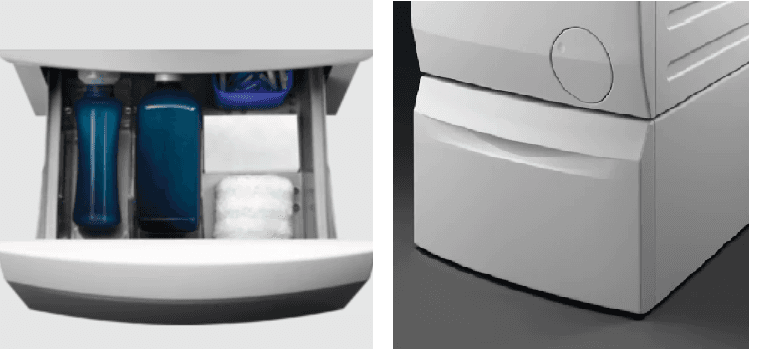 - Der Unterbausockel ist 30 cm hoch und verfügt über eine integrierte Schublade für Waschpulver.