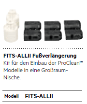 - Fußverlängerungen für die Großraumnische der ProClean-Modelle bis 94 cm sind als Sonderzubehör mit der Bezeichnung FITS-ALLII beim Fachhändler erhältlich.