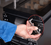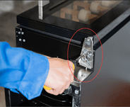 Bringen Sie das untere Scharnier wieder an und befestigen Sie die 4 Schrauben. Stellen Sie das Gerät dann vor dem Gebrauch mindestens 12 Stunden lang auf
