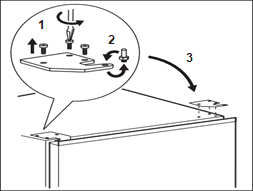 4. Lösen Sie die Schrauben des rechten oberen Scharniers. Stützen Sie die obere Tür mit Ihrer Hand. Entfernen Sie das obere Scharnier, drehen Sie es um, schrauben Sie die Schrauben und den Stift daran. Legen Sie das Scharnier beiseite.