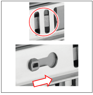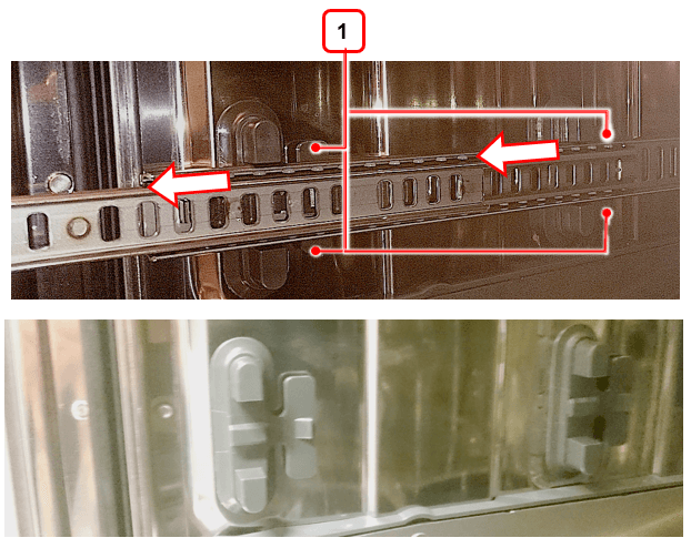 1 - Drücken Sie die vier Druckknöpfe und schieben Sie die Schiene in Richtung der Vorderseite des Geschirrspülers. Diese Bewegung sollte klein genug sein, um die Schienen aus der Wanne zu lösen