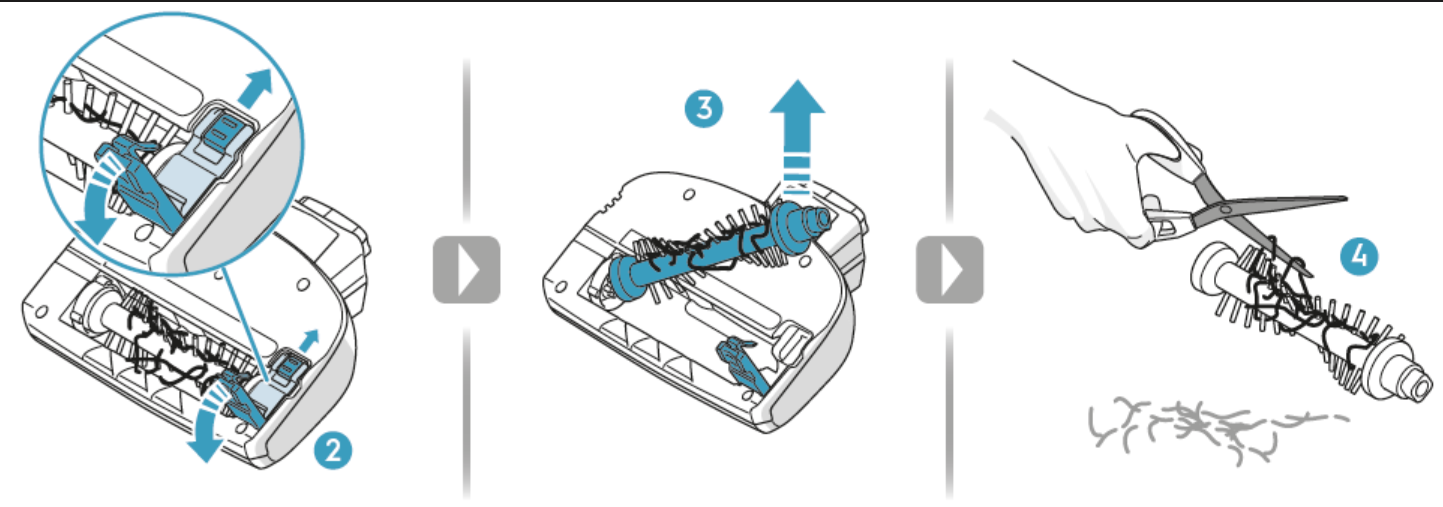 - Entfernen Sie verfilzte Haare, Fäden und Fasern von der rotierenden Bürste. Je nach Modell verewende Sie die BrushRollClean -Taste.