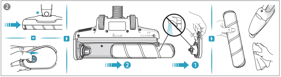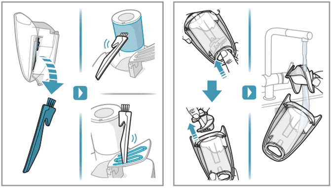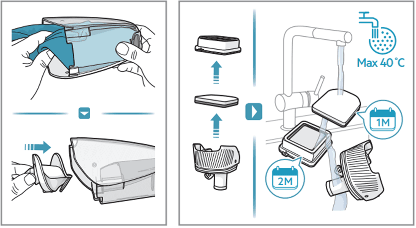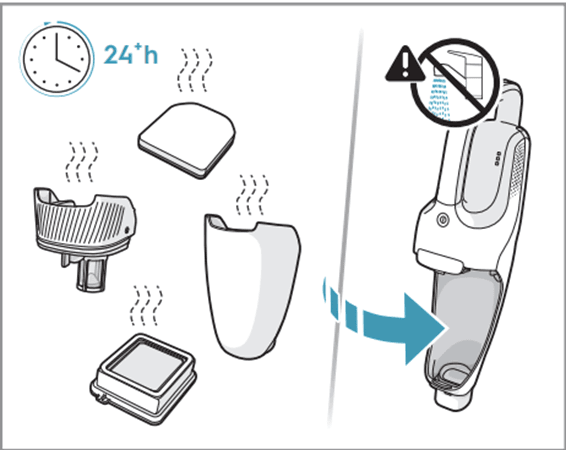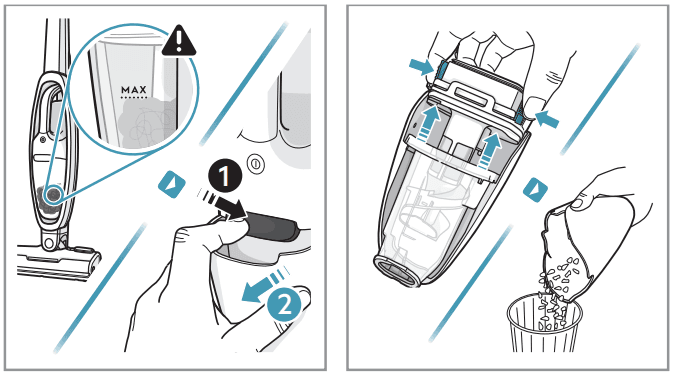 - So leeren/reinigen Sie den Mülleimer und reinigen die Filter in einem Akku-Staubsauger