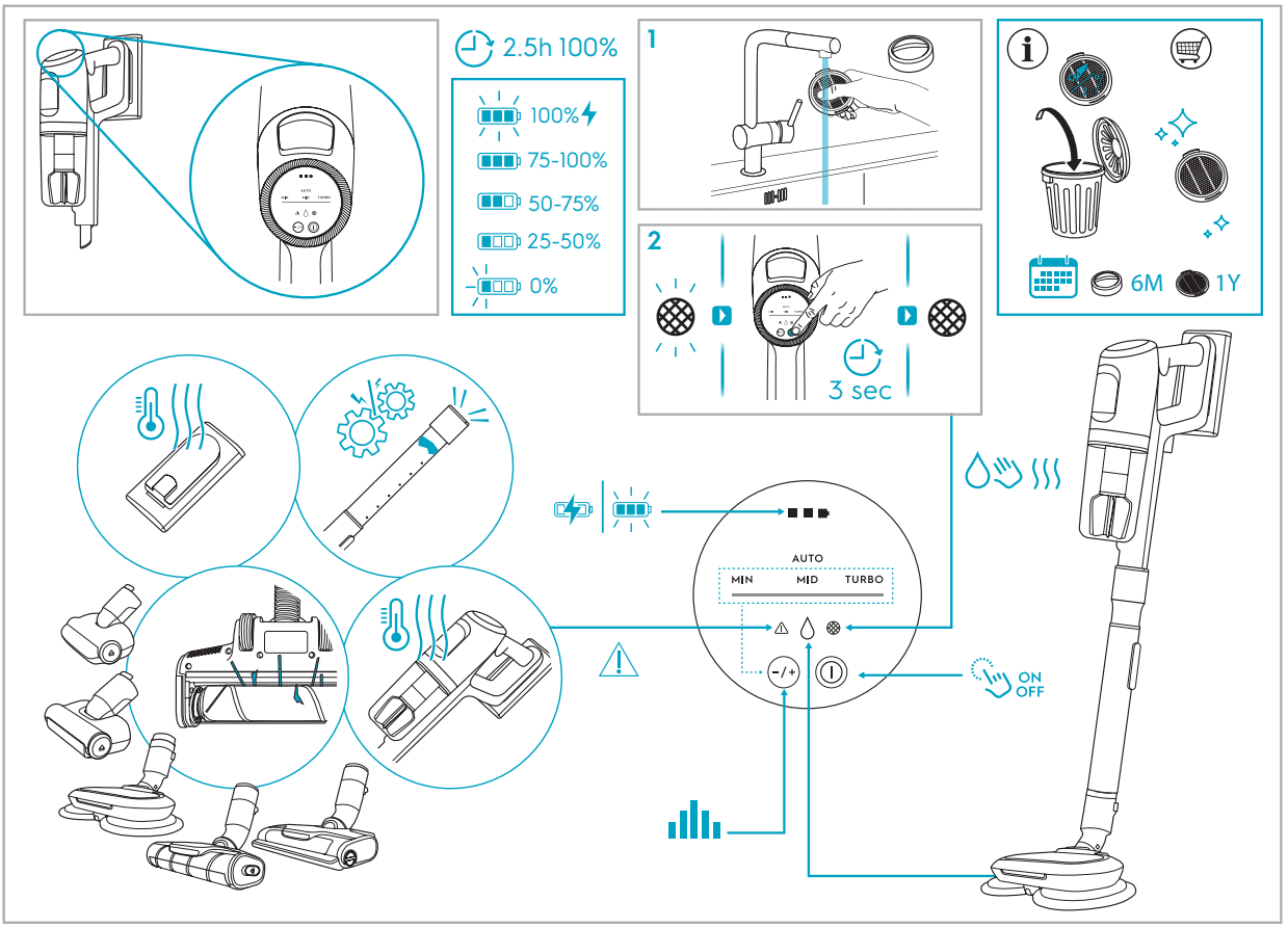 - Damit der Motor nicht beschädigt wird, aktiviert und deaktiviert eine Schutzfunktion den Staubsauger