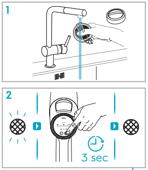 Nach der Filterreinigung/-wechsel setzen Sie die Anzeige „Filter reinigen“ zurück, indem Sie die EIN/AUS-Taste 3 Sekunden lang gedrückt halten