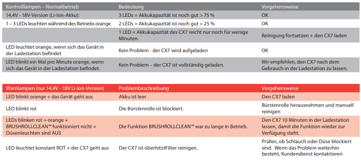 - Was bedeuten die Lämpchen bzw. Leuchten des Akkusaugers CX7?