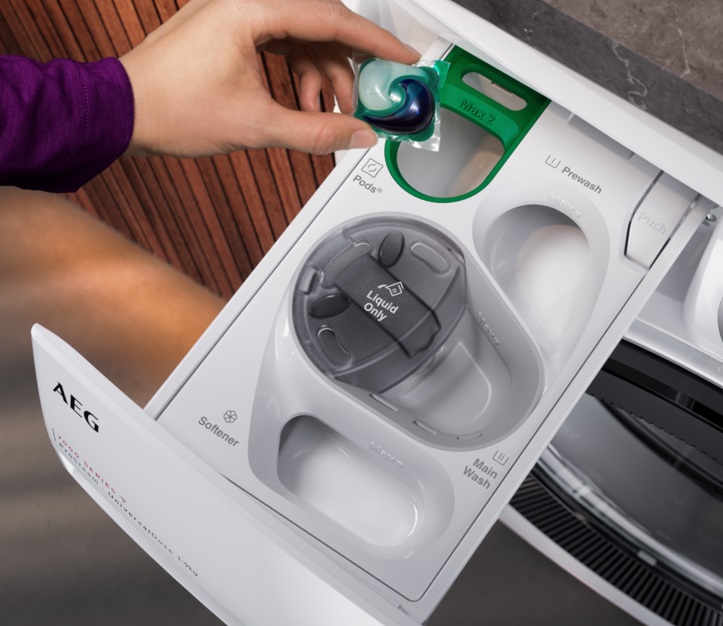- Legen Sie die Waschmittel Pods/Caps in das Fach für Pods/Caps der UniversalDose Waschmittelschublade.