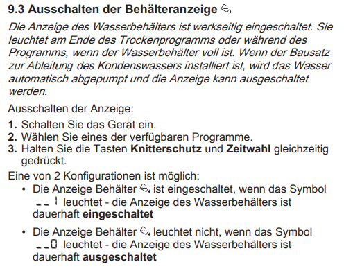- Wie deaktiviere ich die Anzeige "Kondenswasserbehälter leeren" bei meinem Trockner?