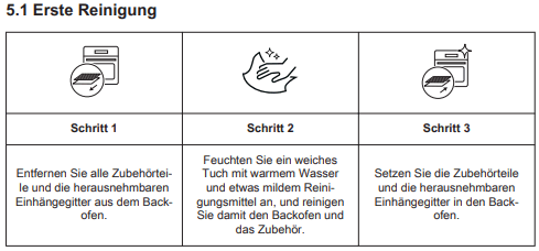 - Reinigen Sie vor der ersten Benutzung den Innenraum des Backofens bzw. Herdes von Hand mit einem weichen Lappen und etwas Spülmittel.