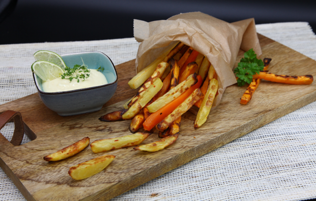 Das Gemüse putzen und in Pommes Frites-Form schneiden.